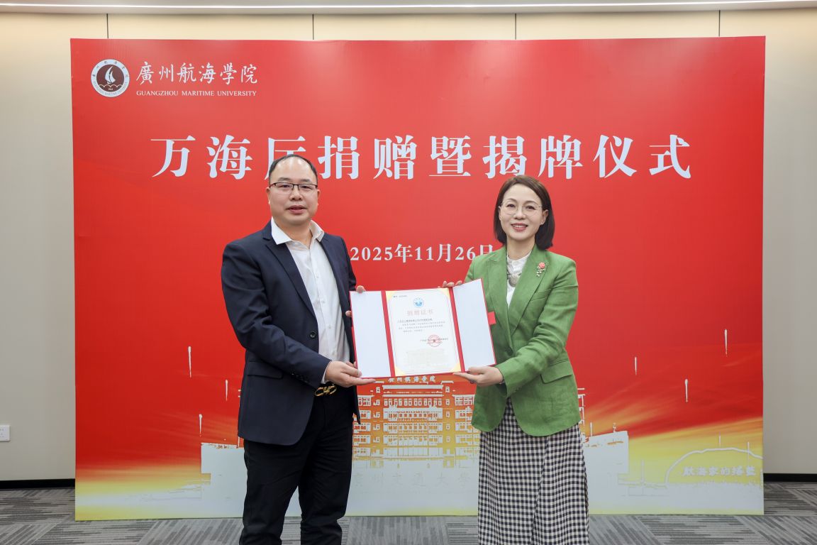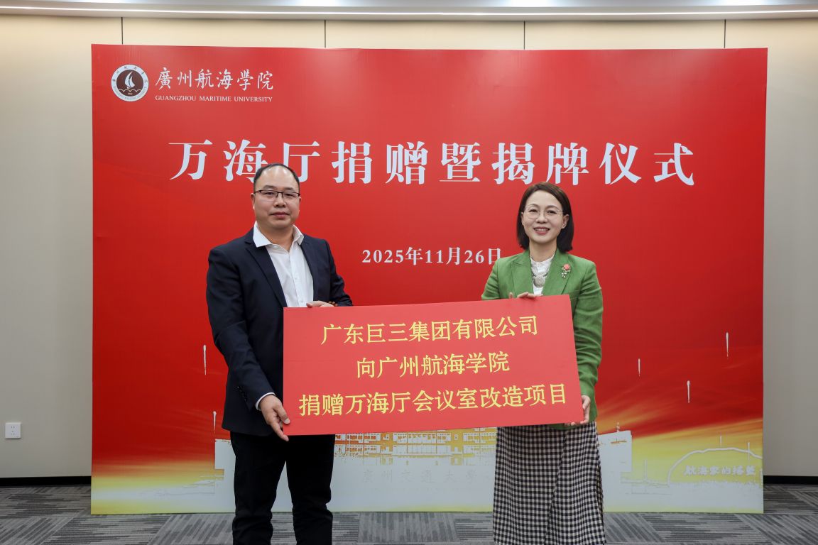 仪式现场暖意融融,由卢任贵校友联合广东巨三集团有限公司总裁王伟先生共同出资捐建的“万海厅”正式亮相,成为校企深化合作、校友反哺母校的重要标志性成果。活动中,卢任贵代表集团向学校交付“万海厅”钥匙,陶韶菁代表学校接受捐赠,并向卢任贵校友颁发捐赠证书。