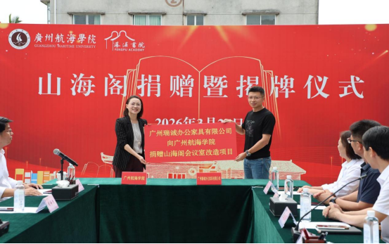 3月26日下午,广州航海学院在琶洲校区图书馆举行“山海阁”捐赠暨揭牌仪式。学校党委书记陶韶菁、广州瑞诚办公家具有限公司总经理黄勇等领导嘉宾出席仪式并共同为“山海阁”揭牌。学校党委副书记胡命杰,纪委书记陆志英,副校长陈建平出席仪式,副校长张劲文主持仪式。